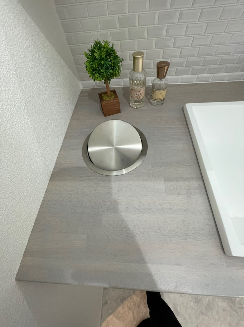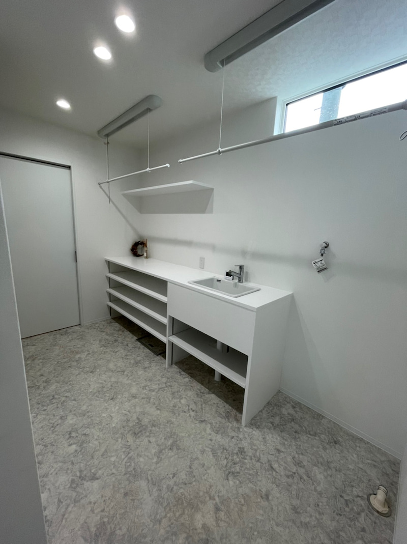 洗濯機の横に造作で作ったスロップシンクに作業棚