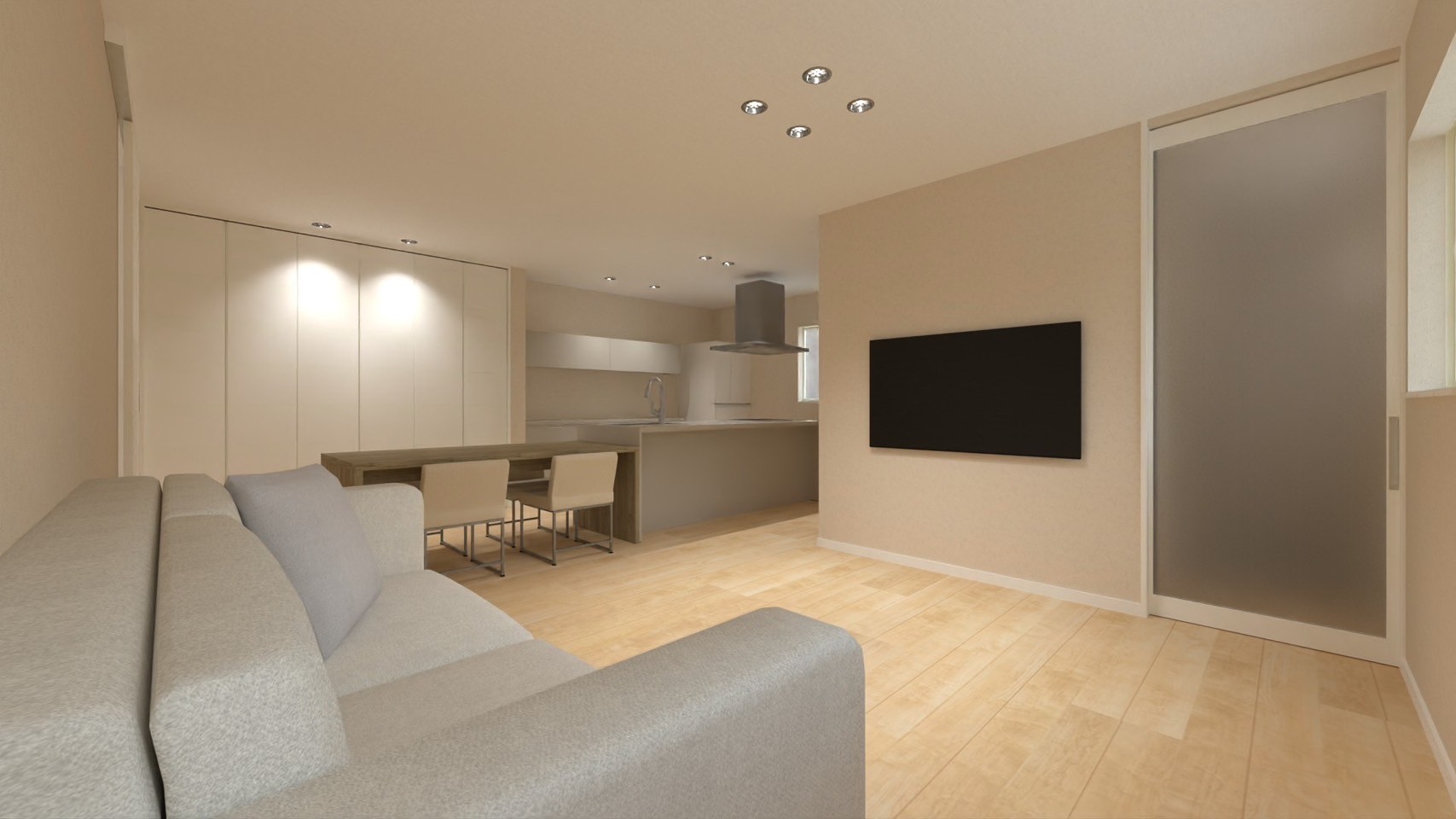 全体的に柔らかい雰囲気となる様ペールトーンでまとめたインテリアプラン。メインクロスはアッシュベージュのキッチンに合うようウォームグレーを使用し、照明や建具の白でアクセントをつけました。