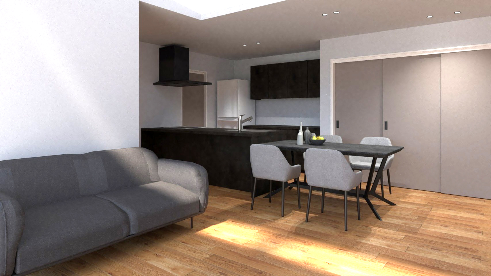 家事に対して必要最小限のコンパクトでシンプルな動線を建物西側で構成させ中心から東側では、寛げるLDKと寝室、また一時的にお子様の小さいうちに利用する子供室(キッズスペース)を用意することで、広がりを持たせました。