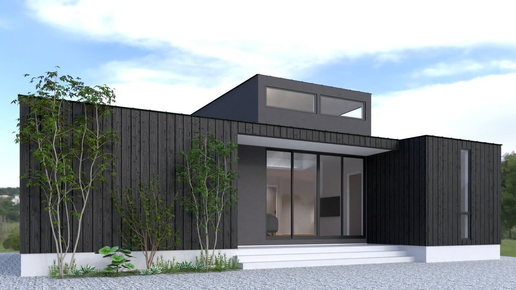 贅沢な空間の使い方、アクセントの焼杉外壁、シンプルかつホテルライクな空間。