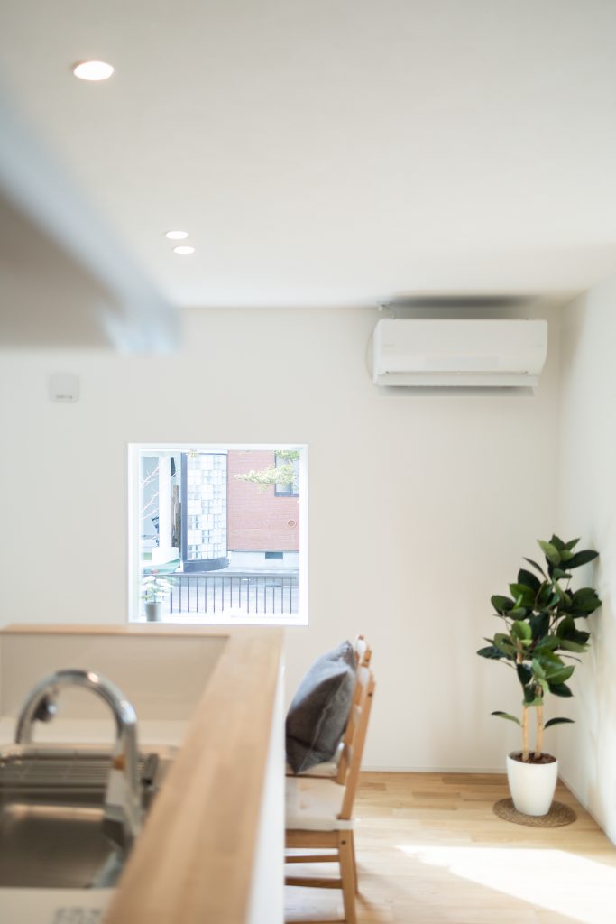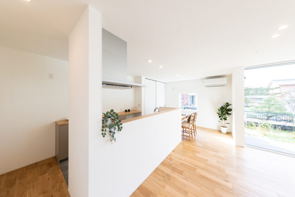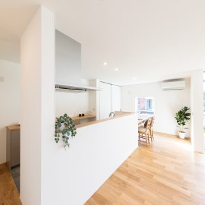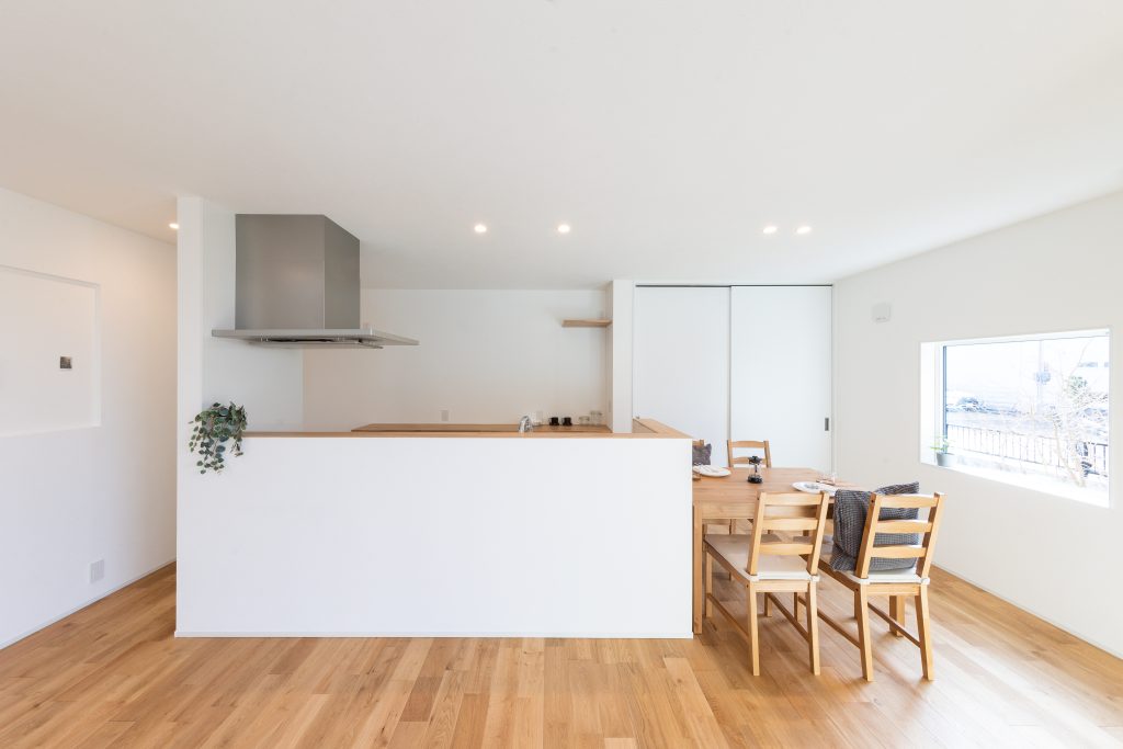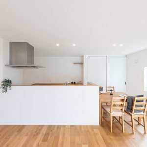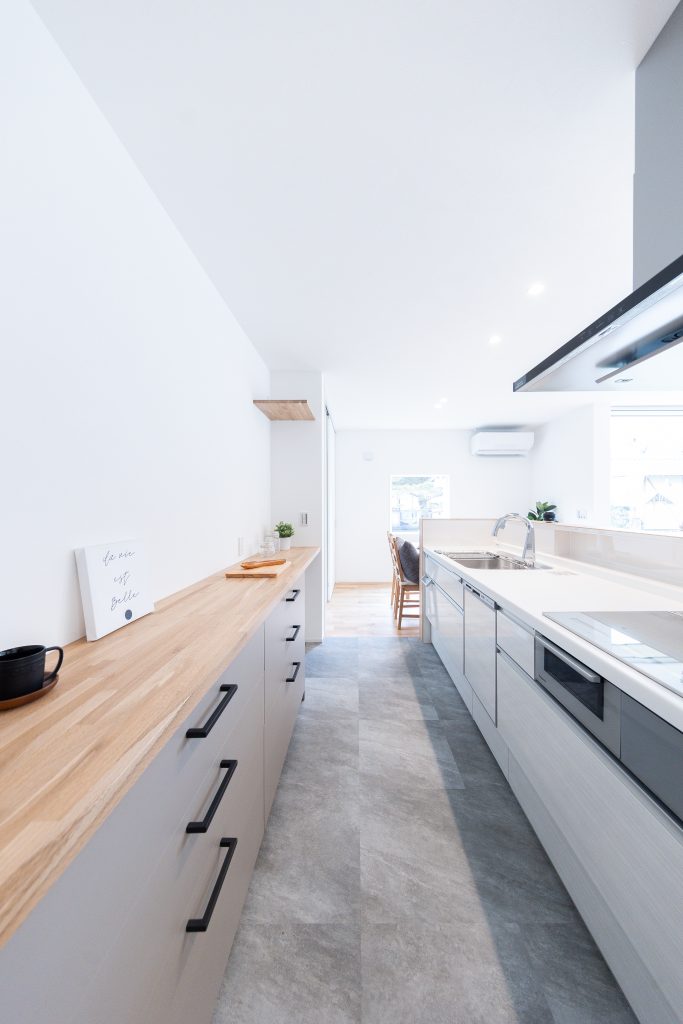 キッチン部分の床は水やキズに強いフロアタイルを使用しお洒落さをプラス。
