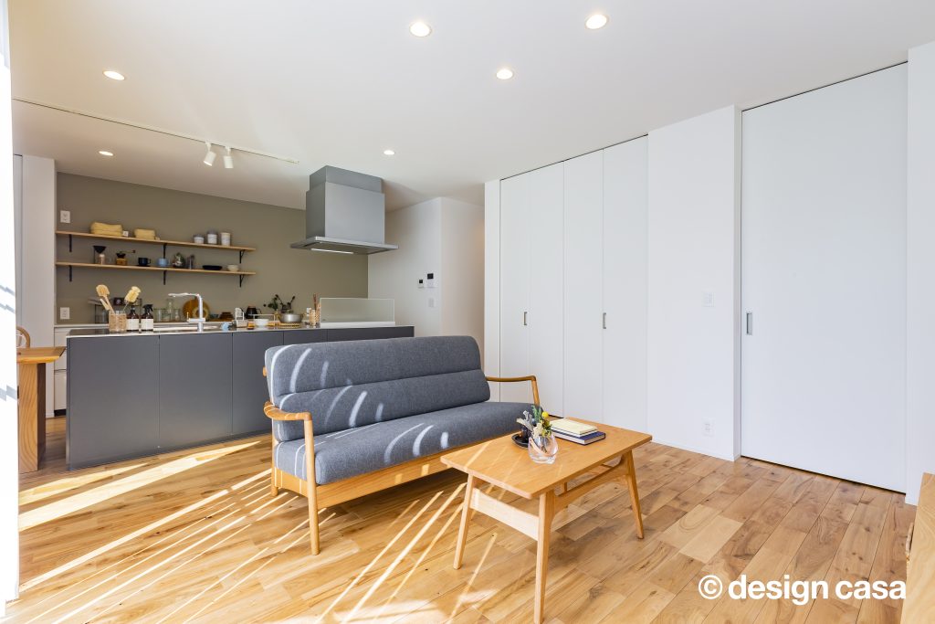北側に開くことも検討しましたが、居⼼地のよい、明るいリビング空間がご要望でしたので直接の採光を取り込めるように、