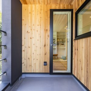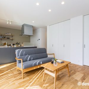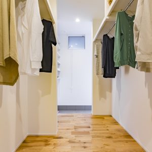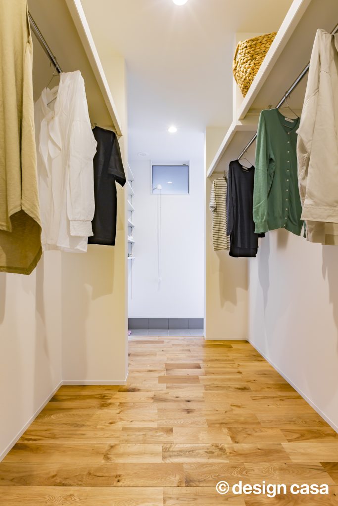 家事動線が楽になるように、帰ってきてから、コートや荷物を置けるクローゼットを設け、⼿を洗い、リビングに⼊れる動線を作りました。