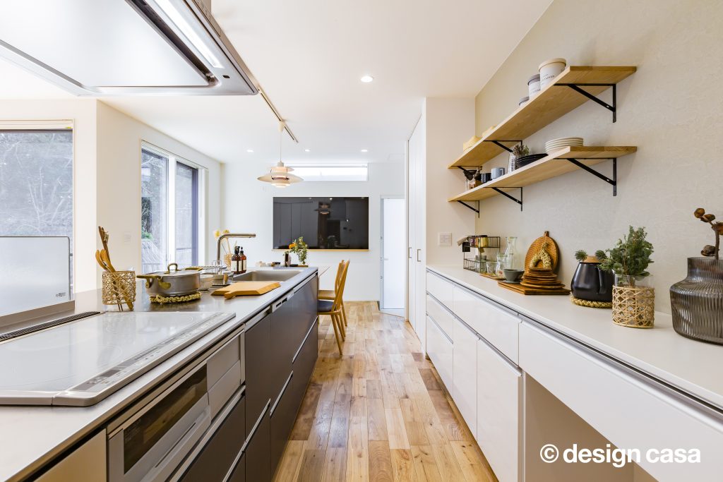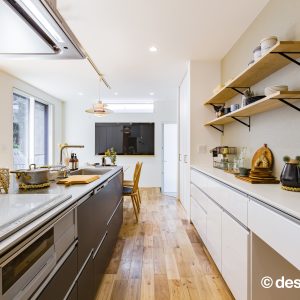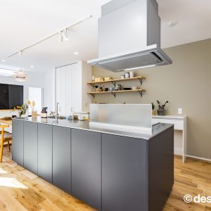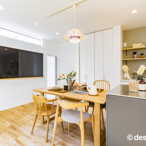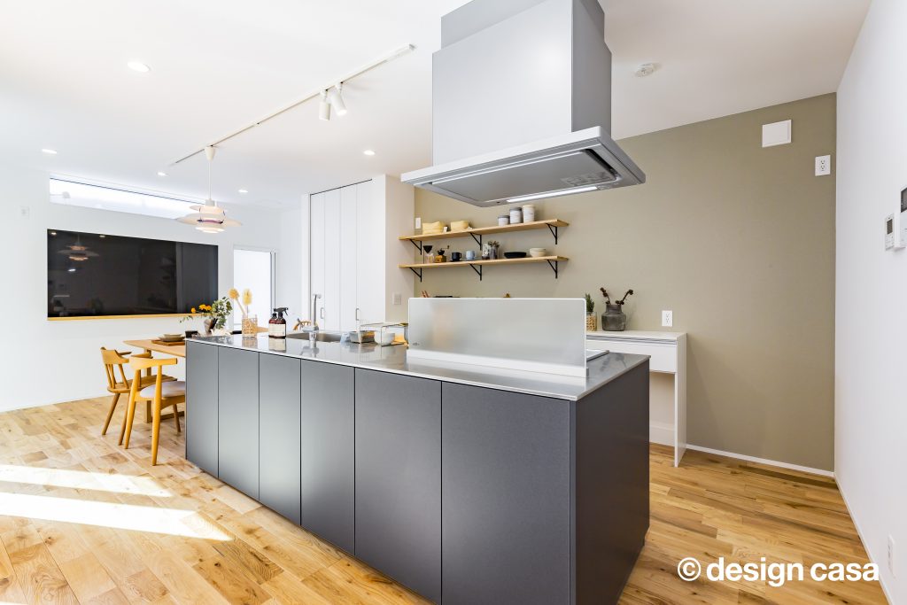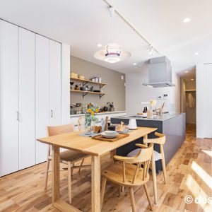キッチンとダイニングテーブルを横に並べることで、⼦供の勉強を近くで⾒れるように、またキッチンを回遊できるようにアイランドとしています。
