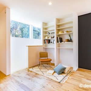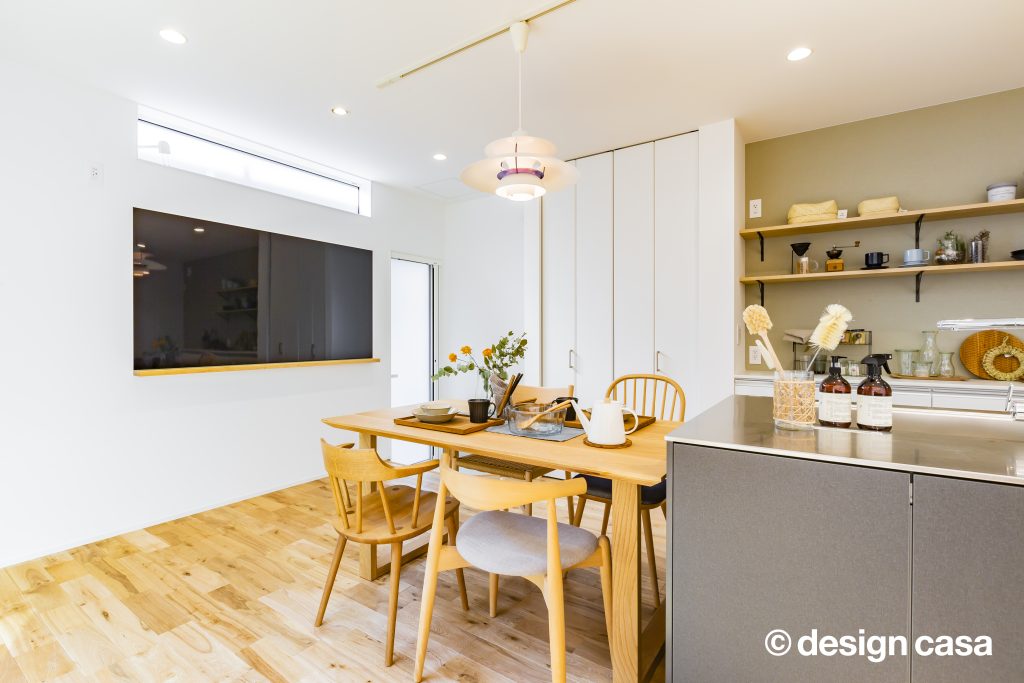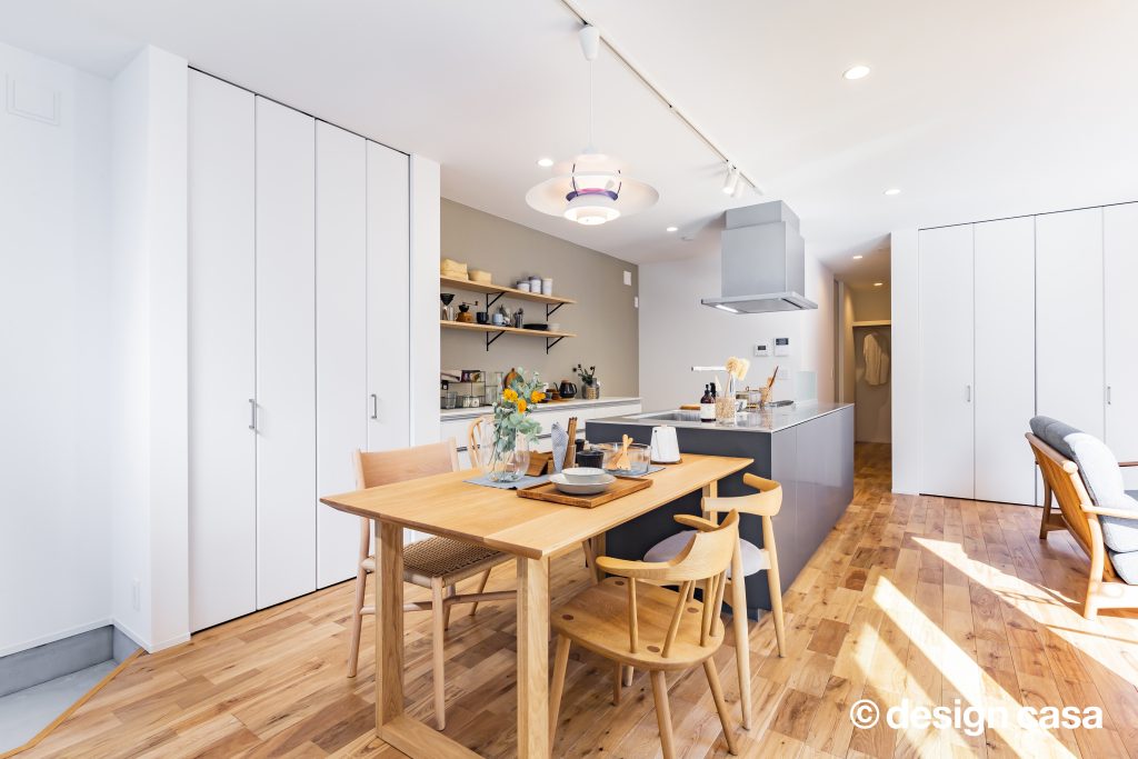ダイニングの近くには⼦供たちの収納を近くに配置することで、⽚付けもスムーズに出来るように計画しました。