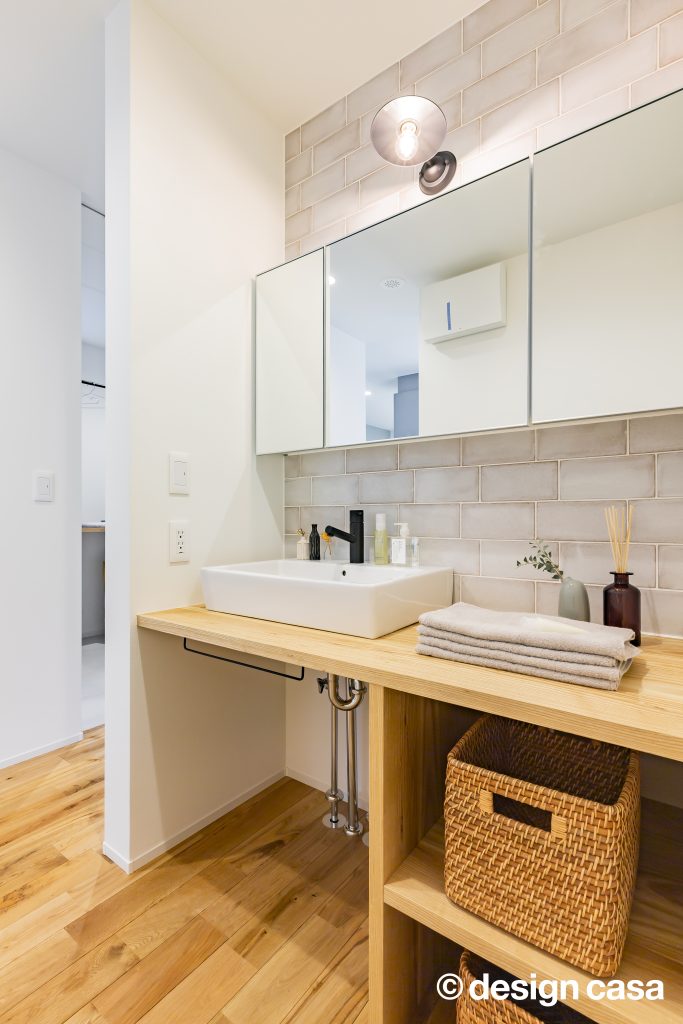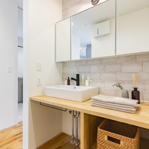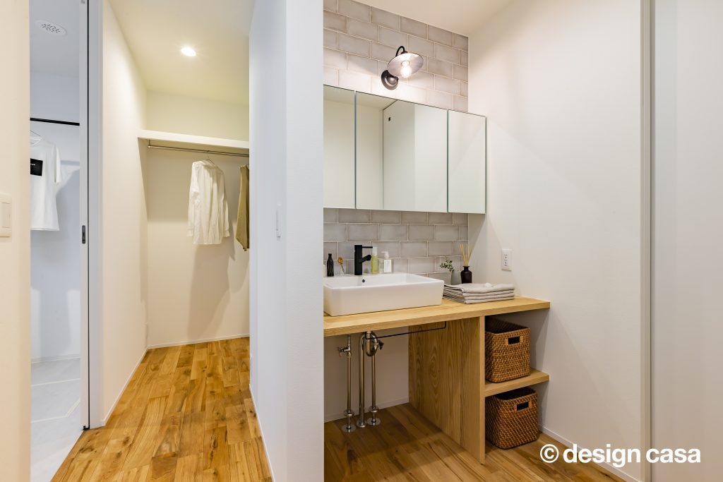 玄関→水廻り→リビング→玄関と家中を回遊できる造りで、生活も家事もラクになるよう動線に配慮した間取り。