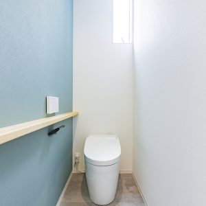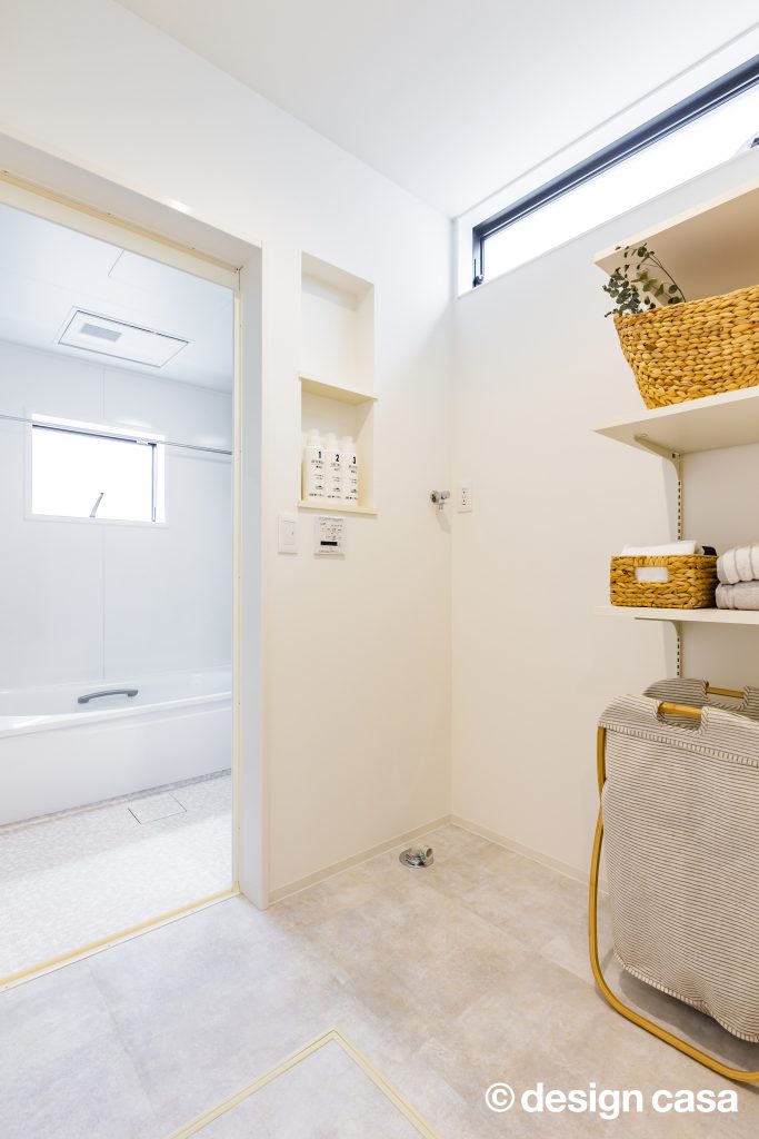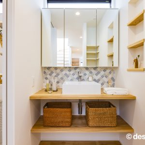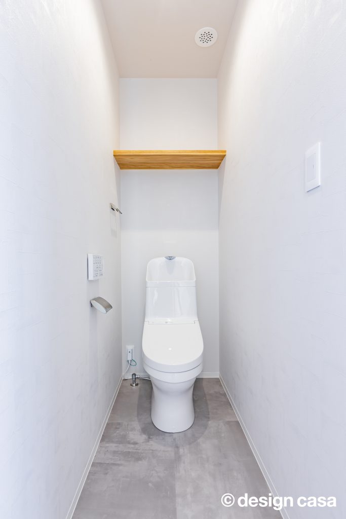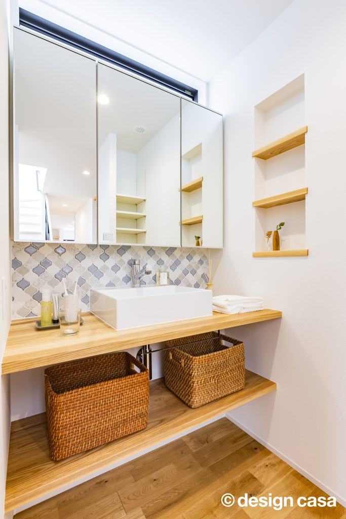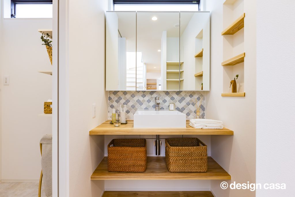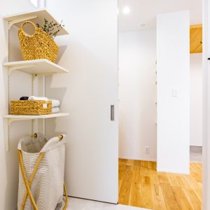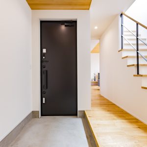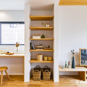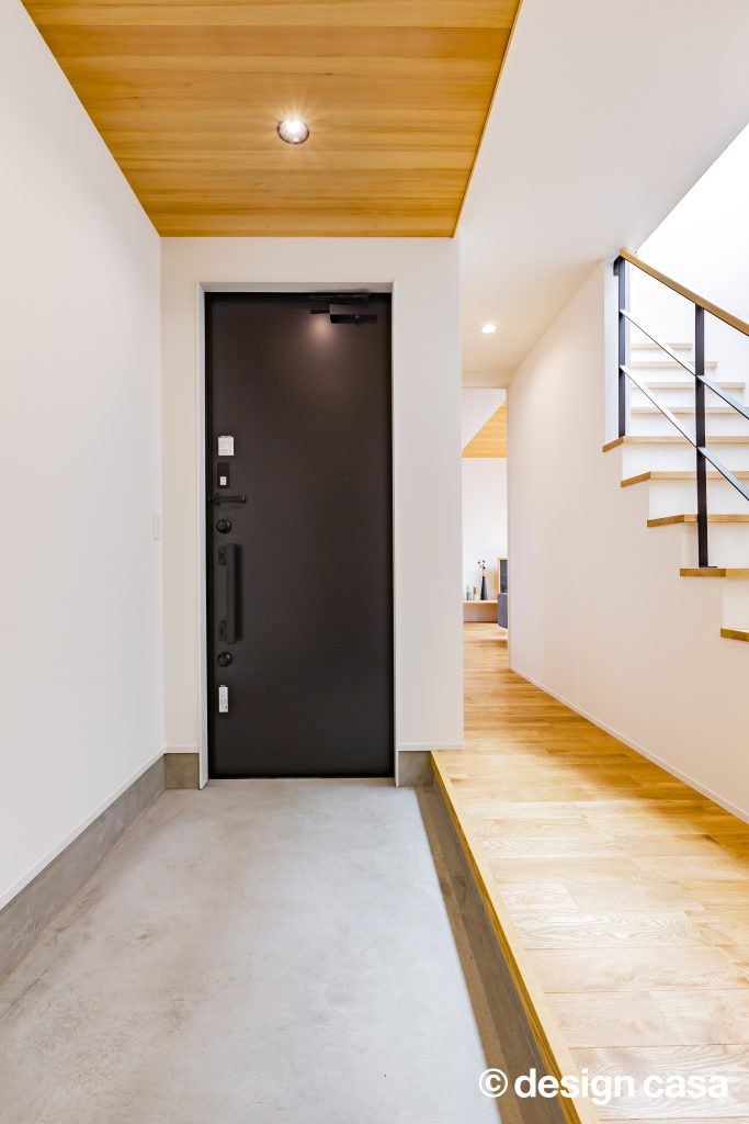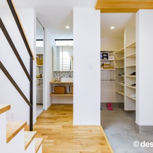 両サイドの空間が完全に分離されすぎず、緩やかに繋がるように、⽞関ホールと繋がる階段、階段吹き抜け部分に⼤開⼝を設けることで外を意識することなく明るく開放的にしたことで中間に⼼地よさをもたらせました。また、スタディスペースを⼆階ホール部分を利⽤しながら、通路としてだけのスペースにならず有効的な繋がるスペースとしています。