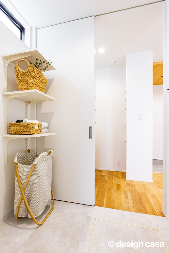 明るさの確保と要望された場合、敷地の南側にLDKを検討しますが、敷地を読むと、東側の隣地建物とは若⼲の距離と⾼低差があるため、家族が集うLDKを東側に寄せるように計画しながら、明るさが確保できるような配置に。また、家族の集まる場所と家族のプライバシーをきちんと分けるようにしたいとの要望から、東側に並べた『LDK(パブリック)BOX』と『水廻り(プライバシー)BOX』を⽞関、『通路(共通)BOX』を中⼼にし、分離する計画にしました。