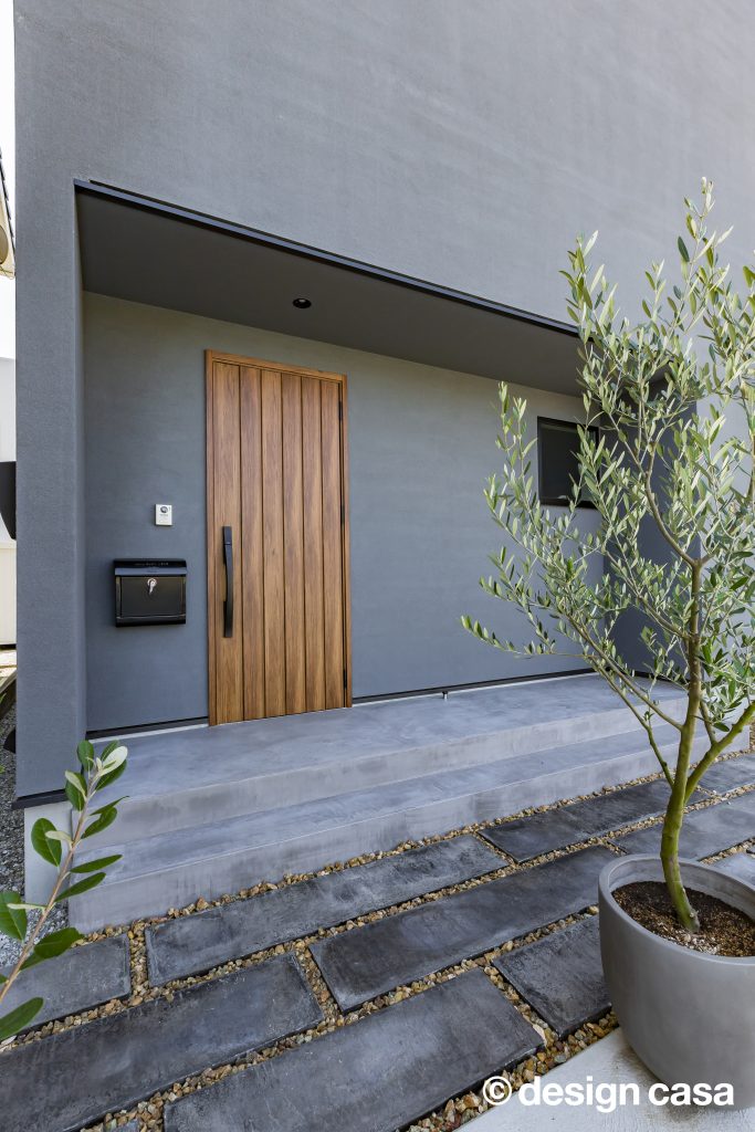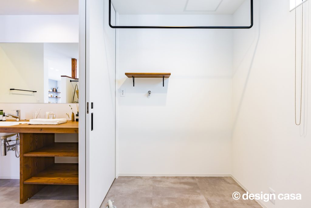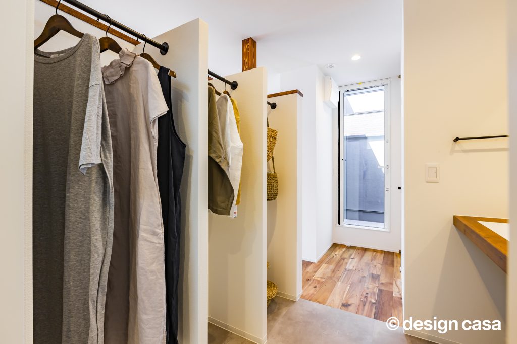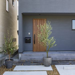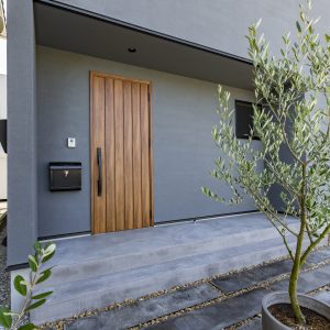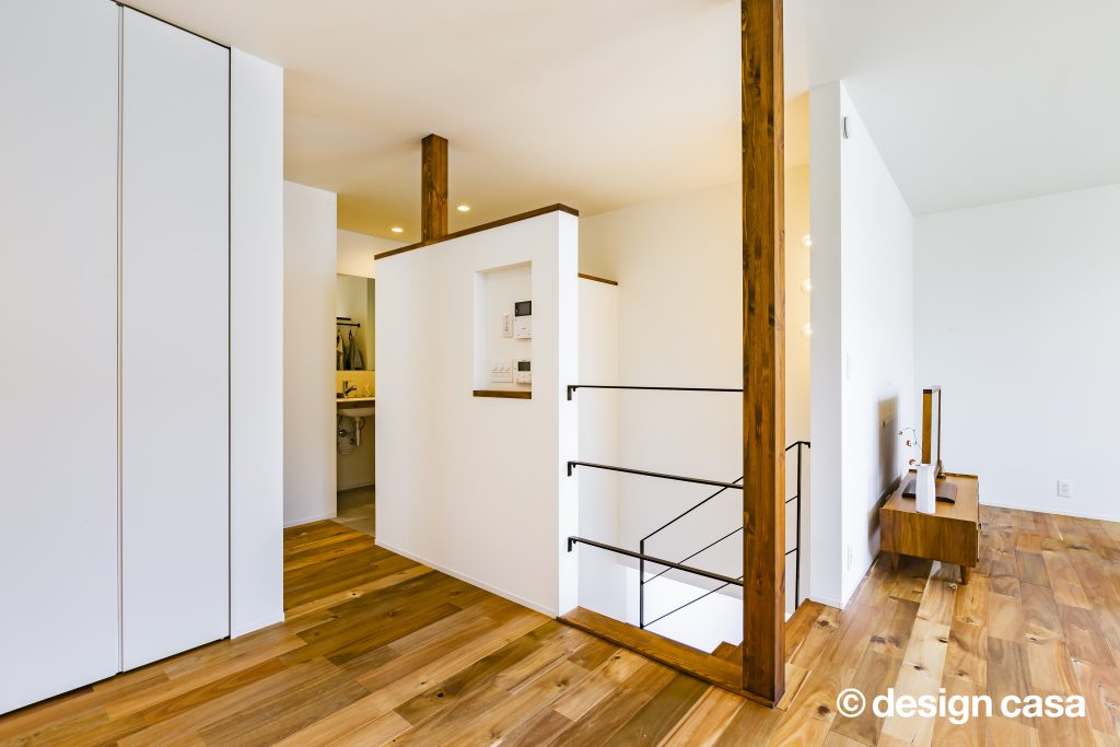 また、⽞関は広がりを感じさせるように奥⾏きが出る⼟間部分のボリュームを広くし、階段もつなげてリビングへ⾃然に上がりたくなる意識になるような動線計画に。