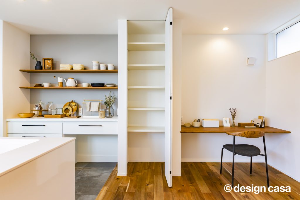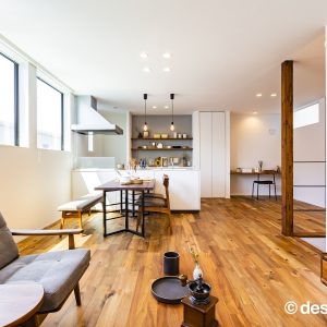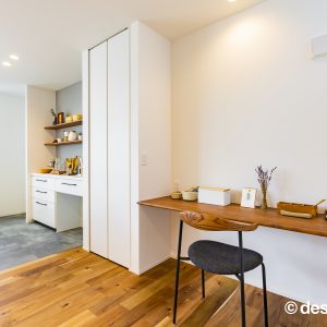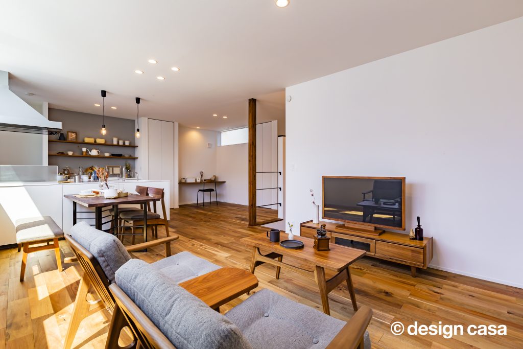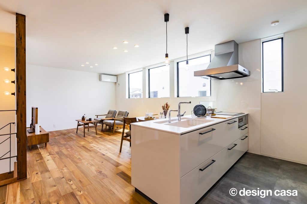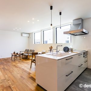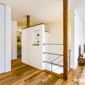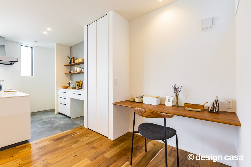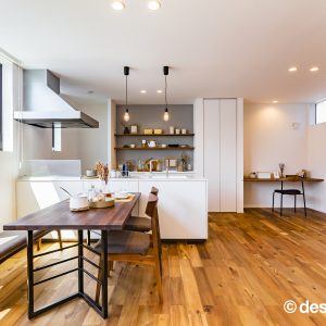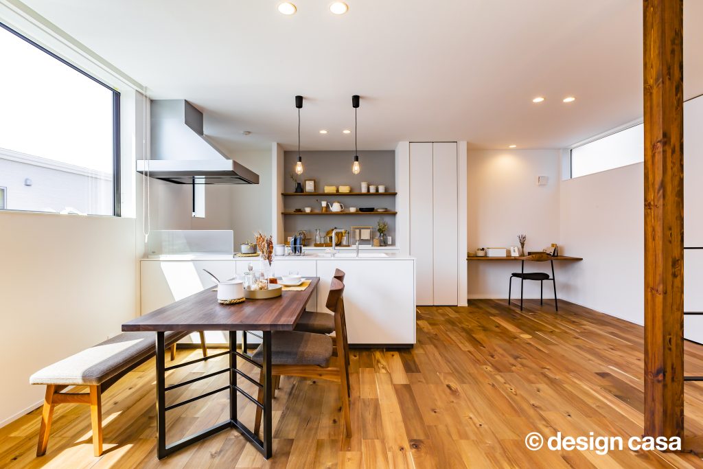 2階へ上がるとキッチン・ダイニングの動線も良く、リビングとの空間は繋がっていてもヌックのような独⽴した⽬的で使え、繋がっている⽔回りのバックゾーンも動きやすいゾーニング。