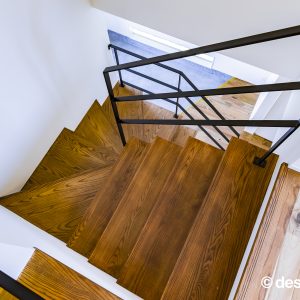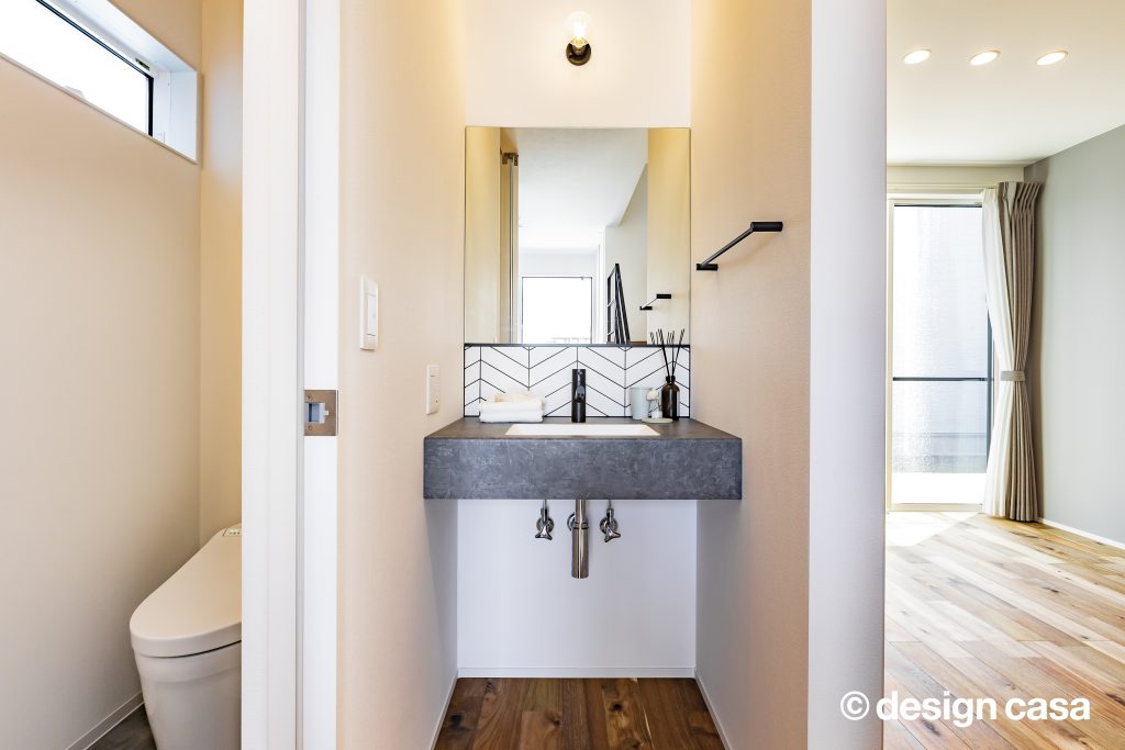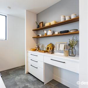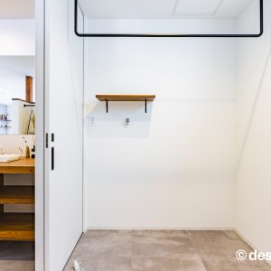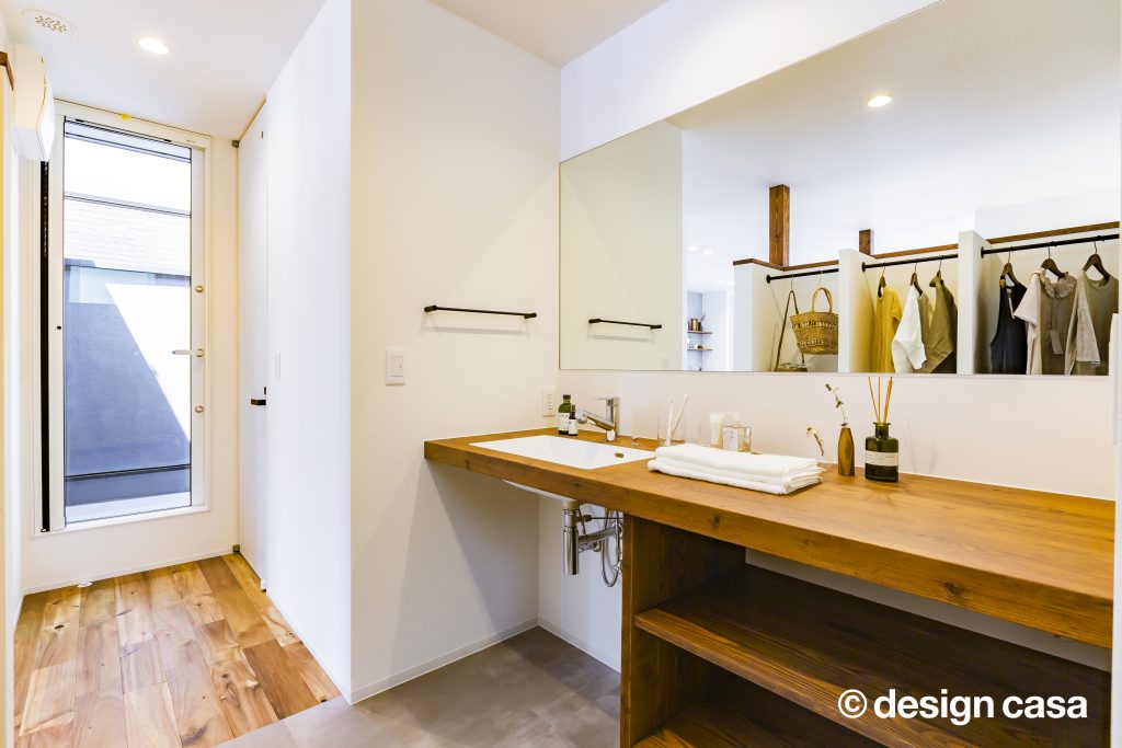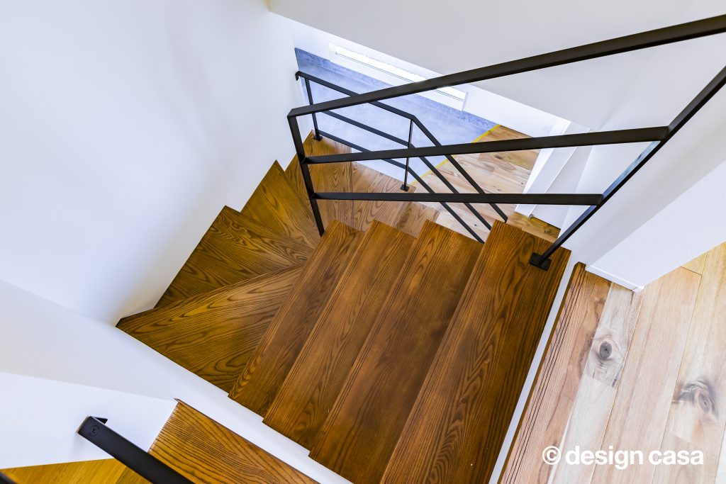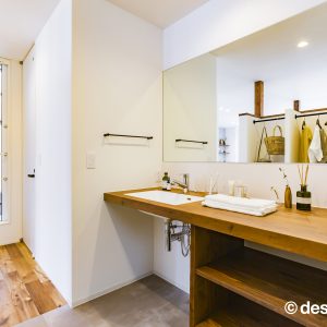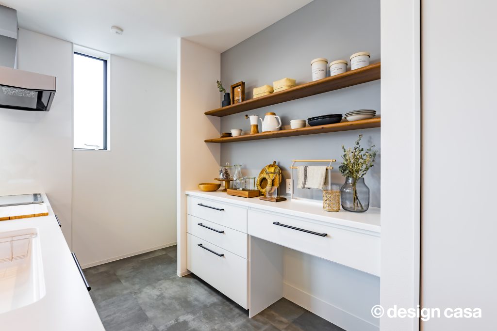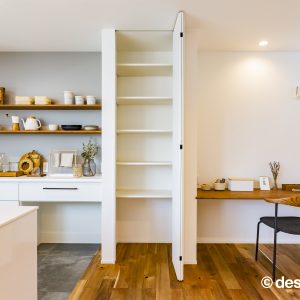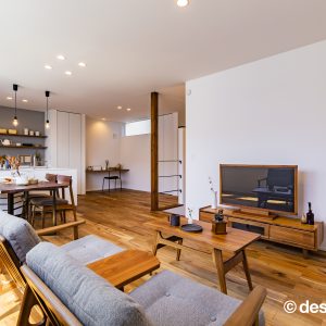 2階へ上がるとキッチン・ダイニングの動線も良く、リビングとの空間は繋がっていてもヌックのような独⽴した⽬的で使え、繋がっている⽔回りのバックゾーンも動きやすいゾーニング。