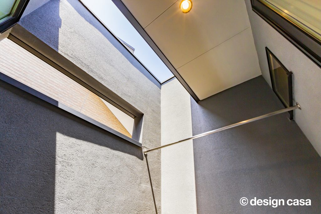 1階は視線カットのために窓は⾼い位置に設定し、2階にバルコニーの外部空間からフライベート感を担保しながら解放性を出す⼯夫を。