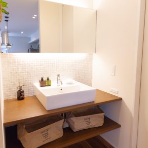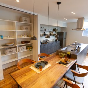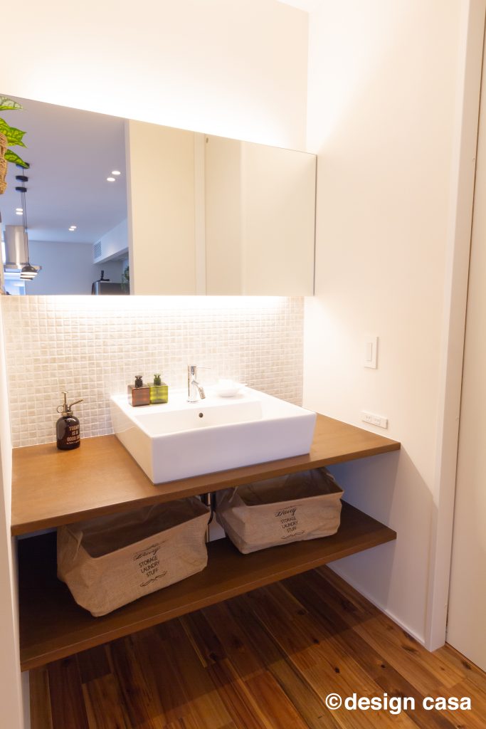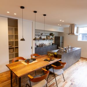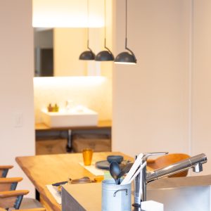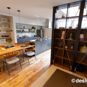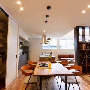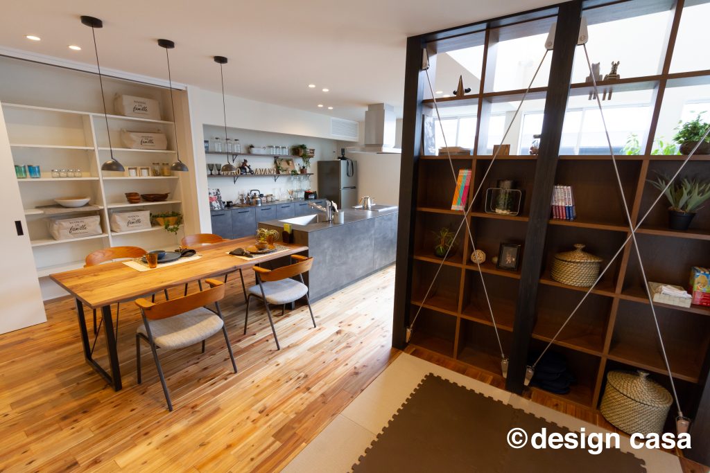 そうでありながらも、間取りはオープンでどこでも家族の存在を感じ、 解放的な空間となっている。 また、ホールからバルコニー外へ視線は抜け、 格子から家に籠った光が流れ、灯籠のような優しい光で外を照らします。