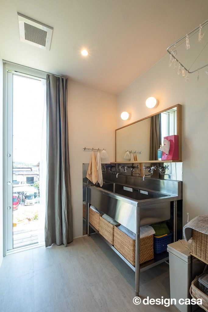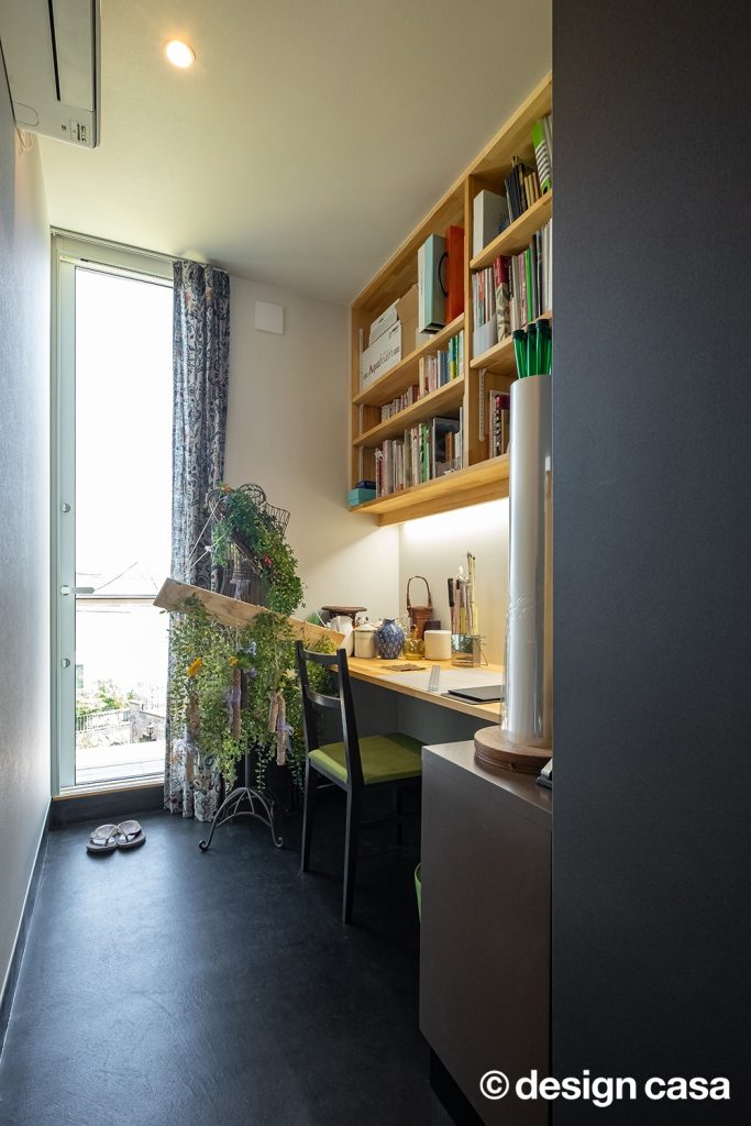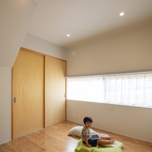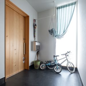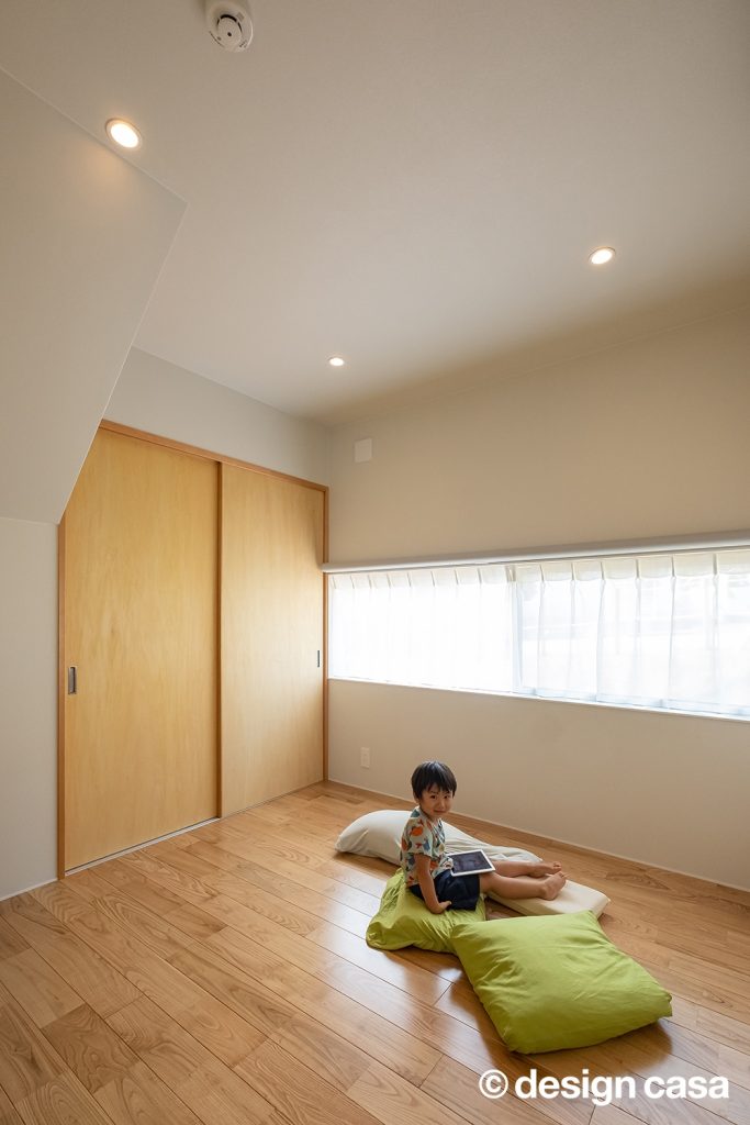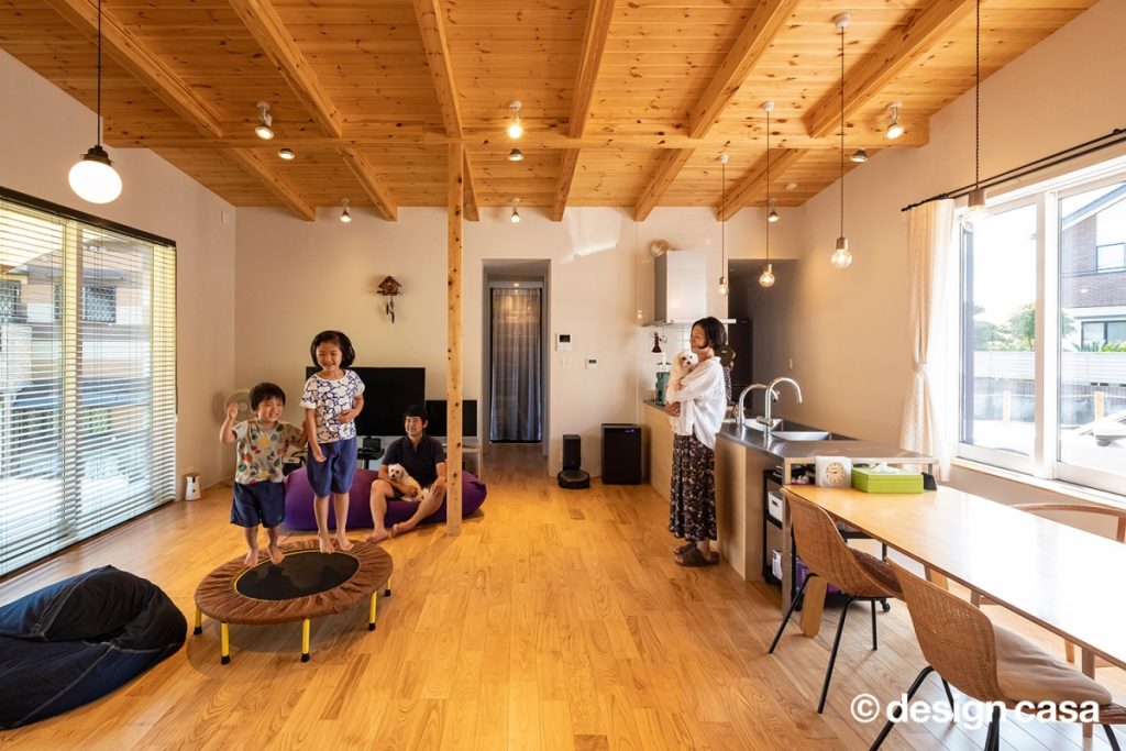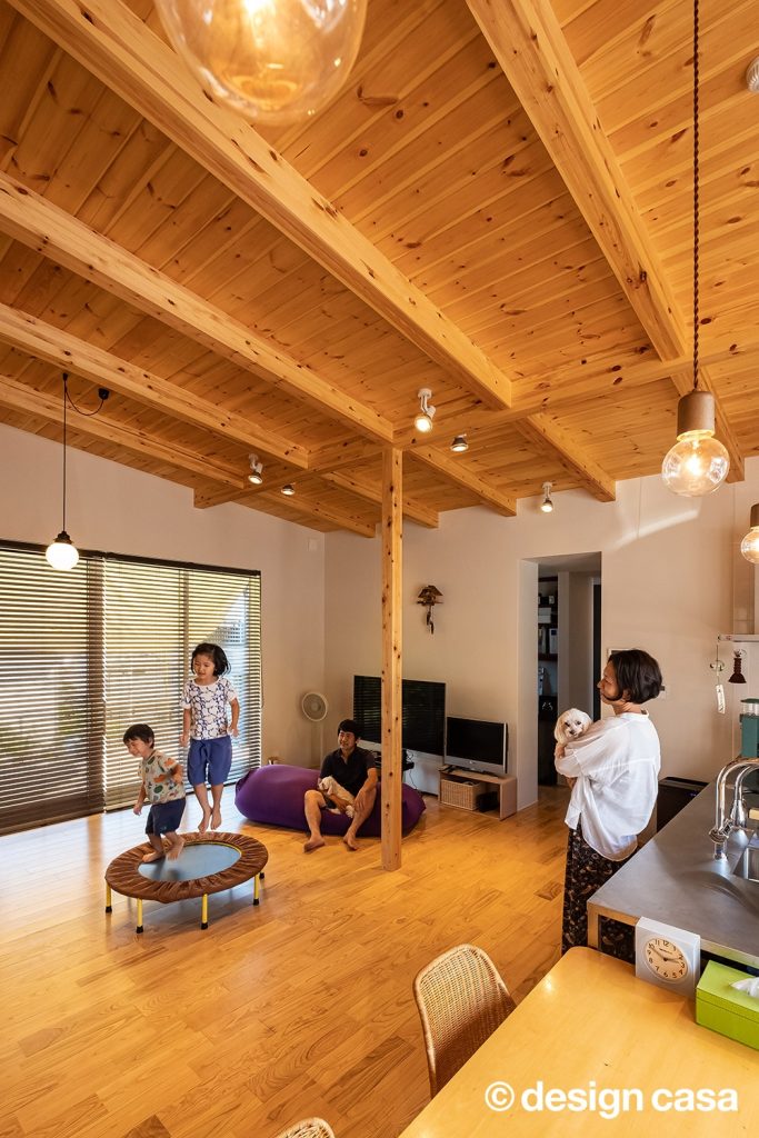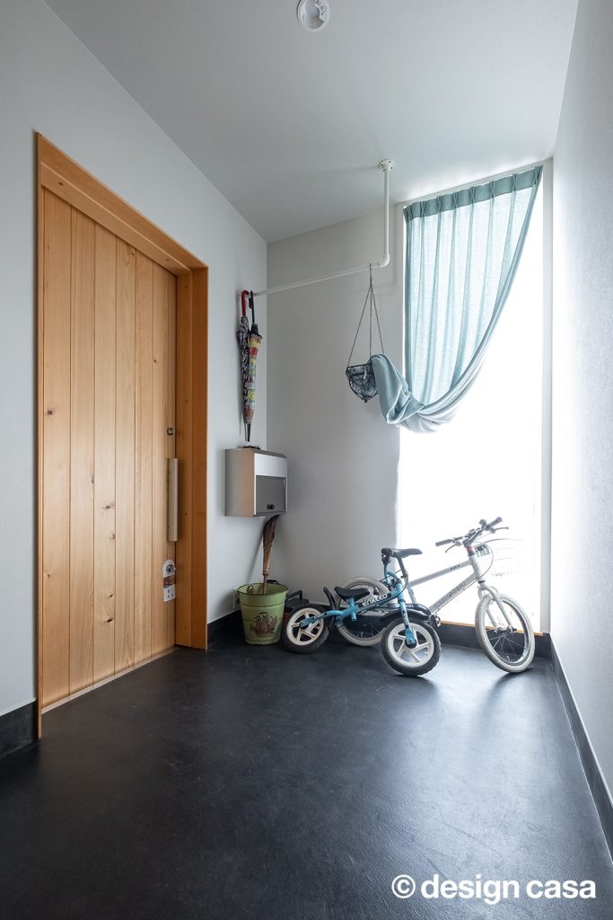生活導線はシンプルに、大きな土間のある玄関にワークスペース。次にリビングダイニングスペース。家族の収納と洗面浴室を経て、家族それぞれのプライベートな部屋に繋がります。入口をもっともパブリックに、奥に行くに従ってプライバシーが高まるような構成にすることで、家族と来客の距離感をスムーズにしました。