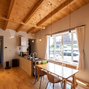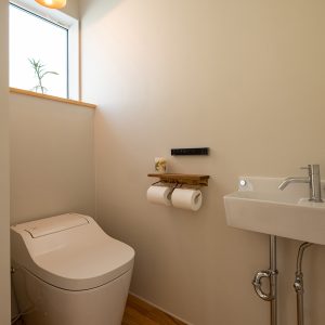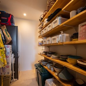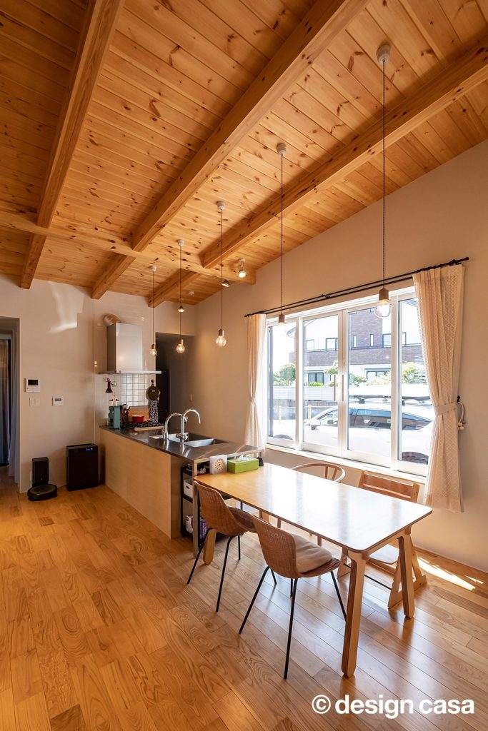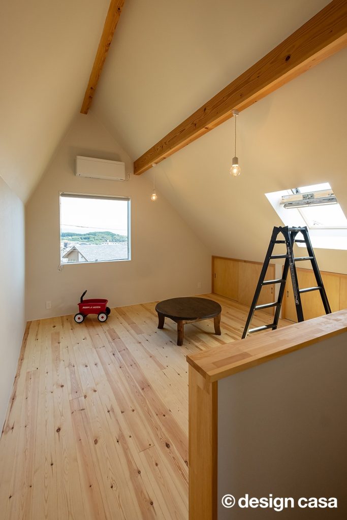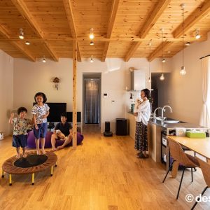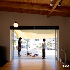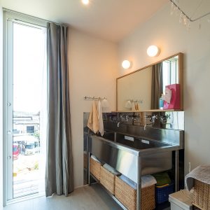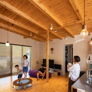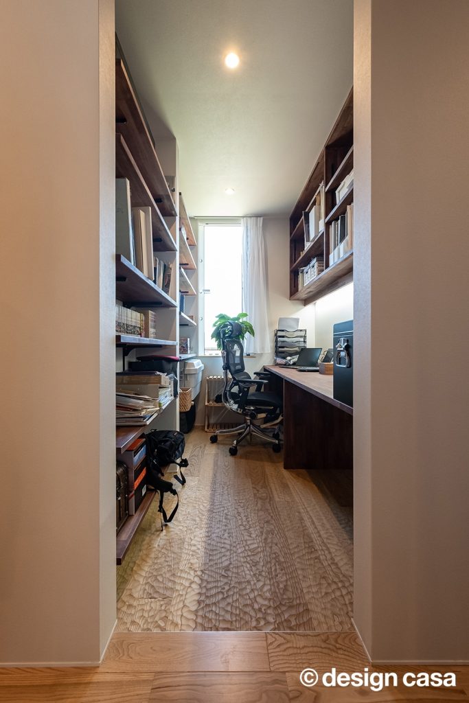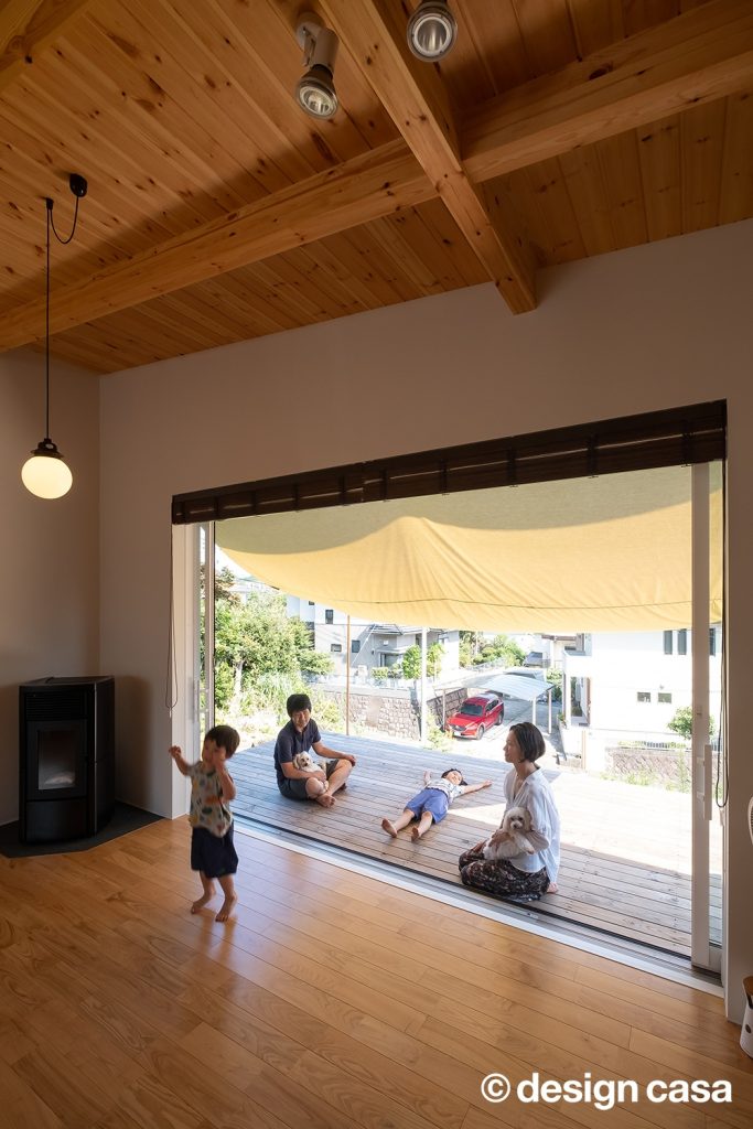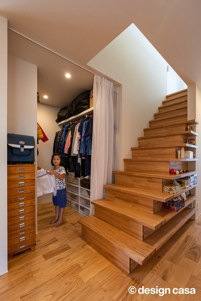 生活導線はシンプルに、大きな土間のある玄関にワークスペース。次にリビングダイニングスペース。家族の収納と洗面浴室を経て、家族それぞれのプライベートな部屋に繋がります。入口をもっともパブリックに、奥に行くに従ってプライバシーが高まるような構成にすることで、家族と来客の距離感をスムーズにしました。