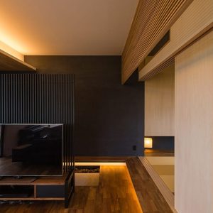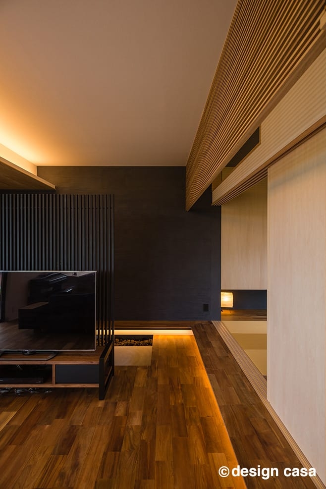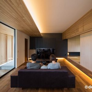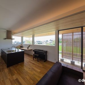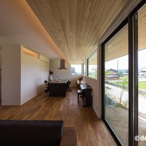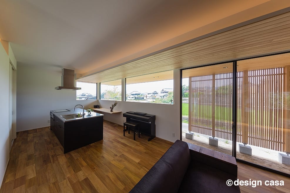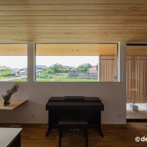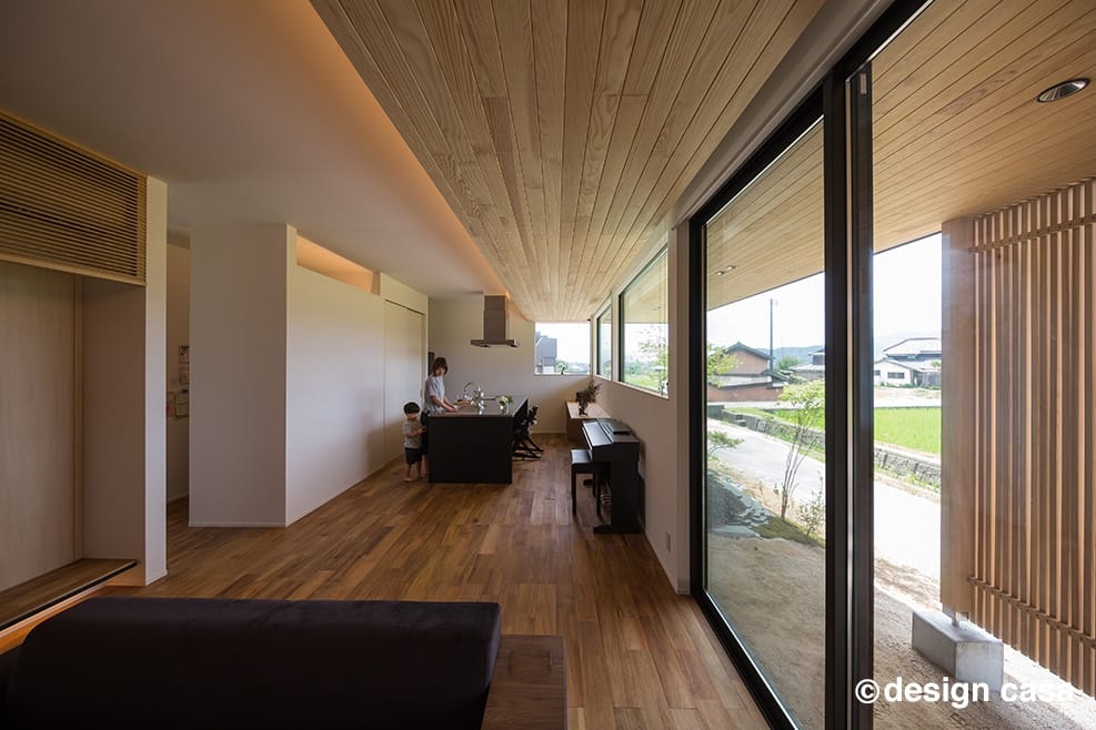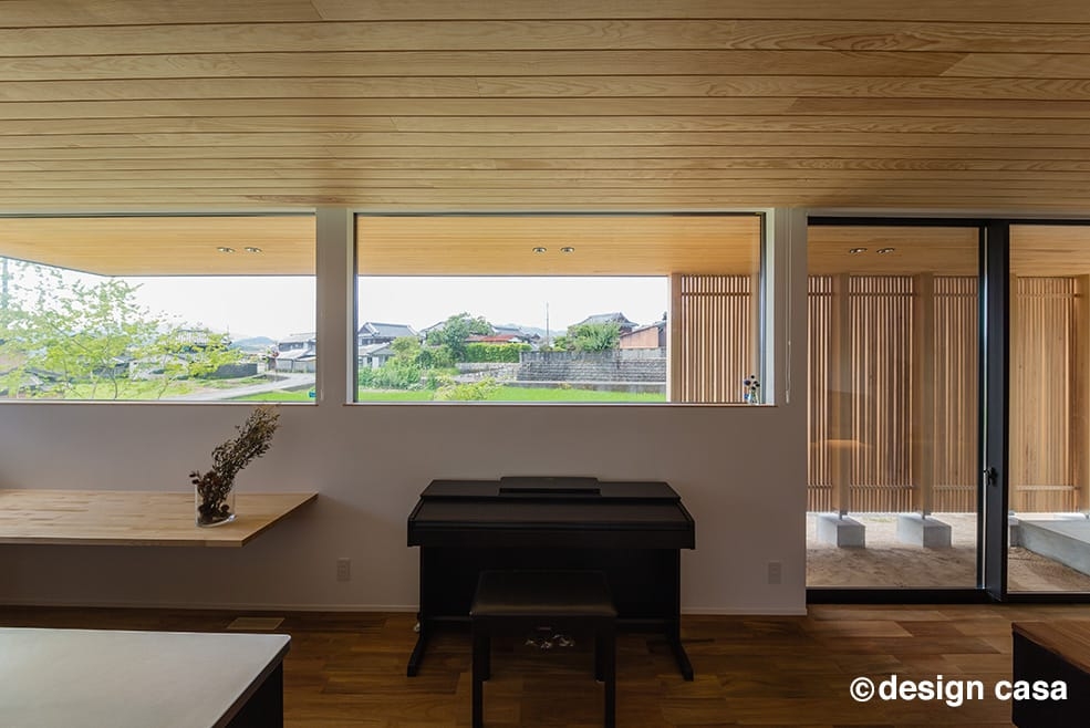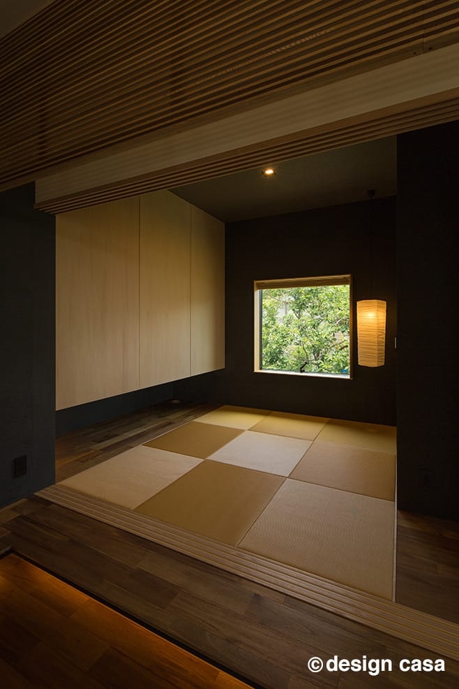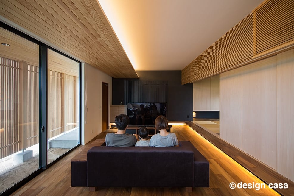 家族、来客、すべてを迎える和室、影をつくる深い軒と格子の存在、窓からきりとられた景色、あたり前の家づくりではなく、ご夫婦が信じる感覚を表現する住まいです。