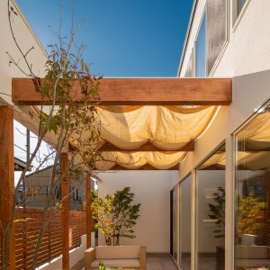 固定された建物の中に風や光をリズミカルに感じるタープによって 家の中に居ながらも、自然の移ろいも感じることのできる暮らしを楽しめるお家です。