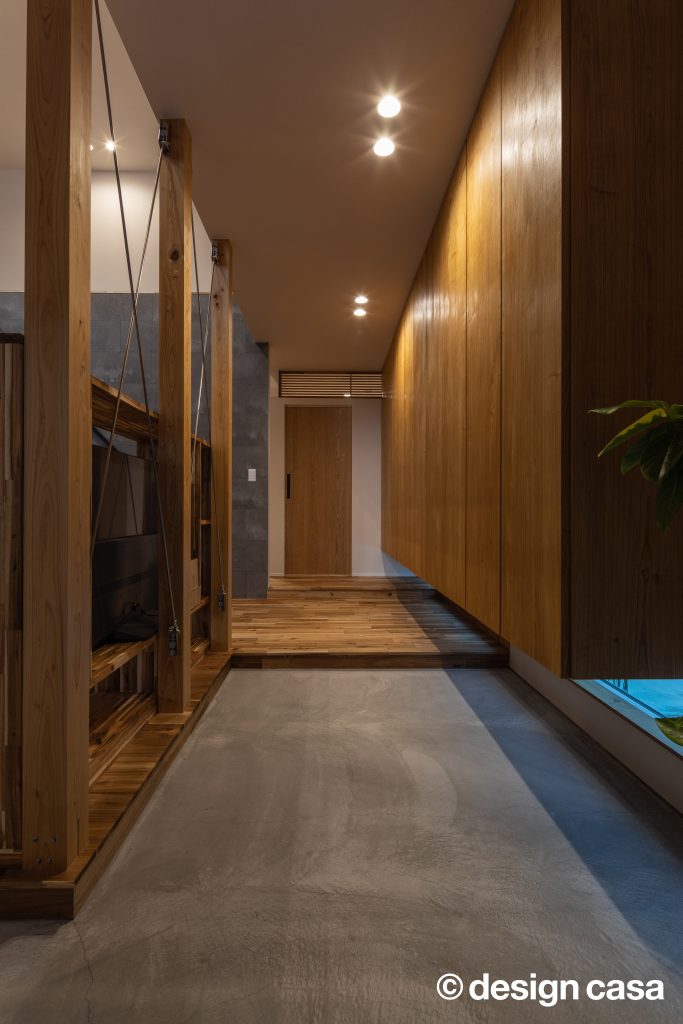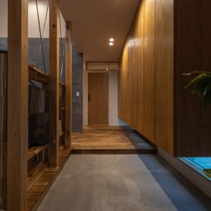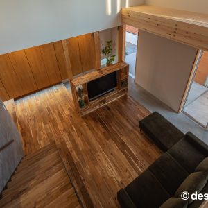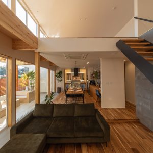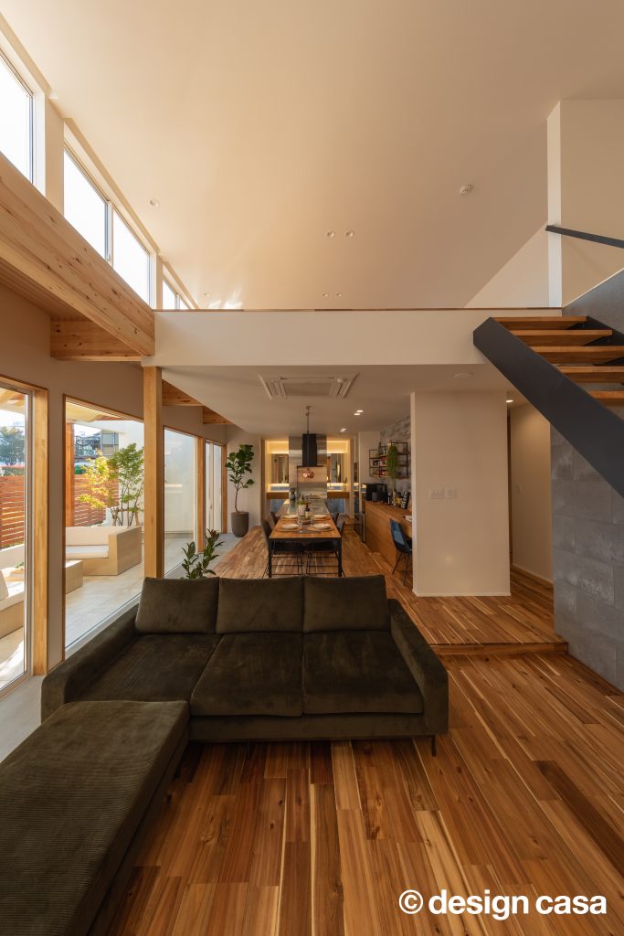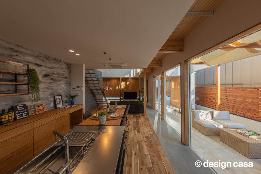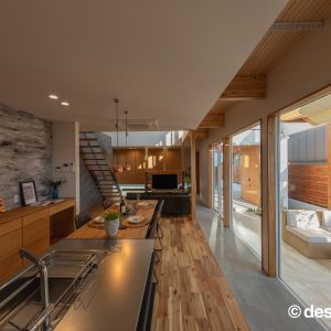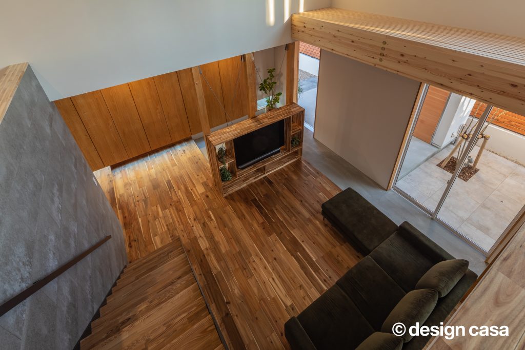 家の中と外が一体となったコートハウス。 アウトドアが大好きなご家族が日常的に屋外を感じて頂くために 提案したのはリビング内部に設けた土間のスペースでした。