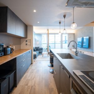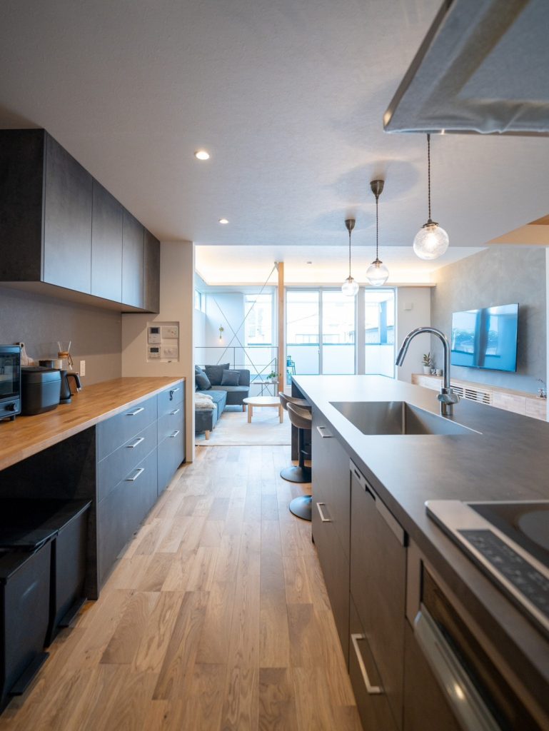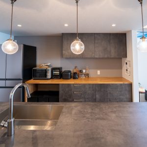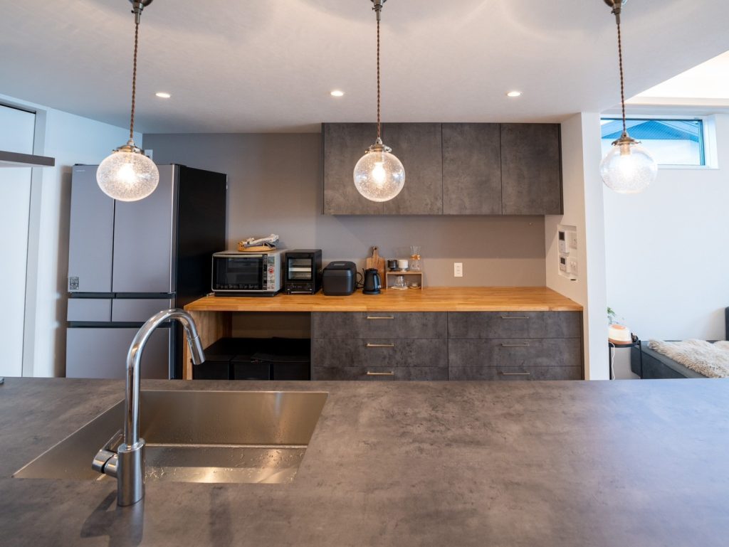 キッチン上のペンダントライトには、シャボン玉のようなまあるいフォルムのオレリアを採用。