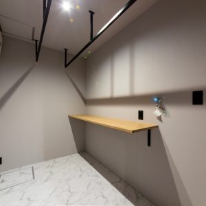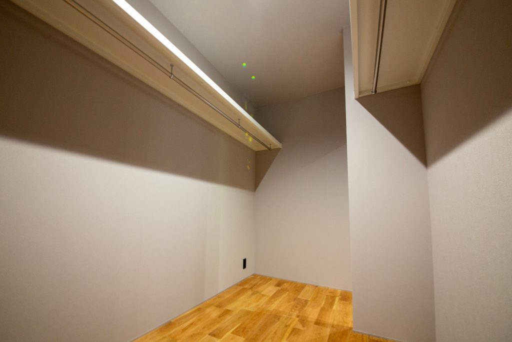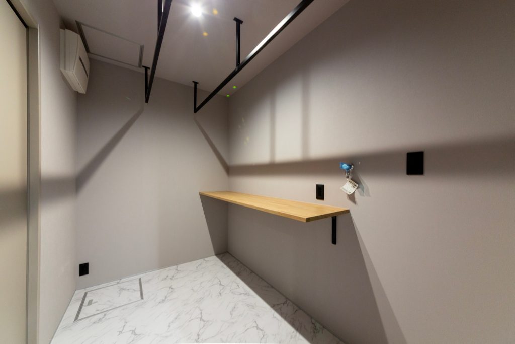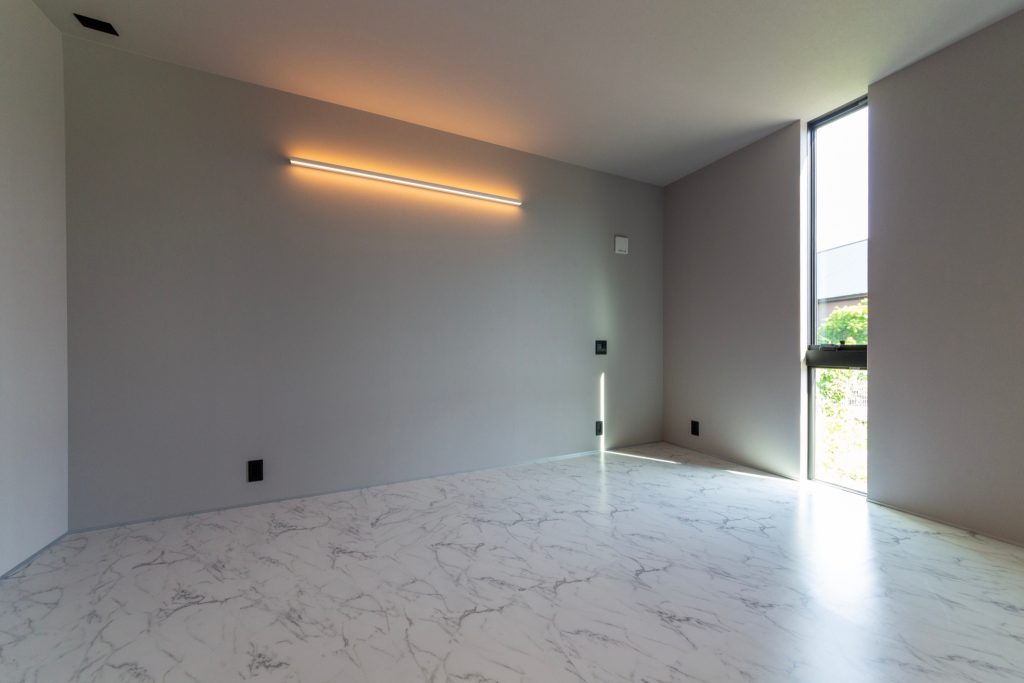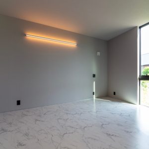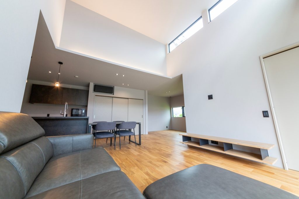 コンパクトな平屋、ホテルライクの洗練されたオシャレな空間、 リビングの高天井、寝室のフロアタイル。 家に帰ってきてもお出かけしているような、特別な空間にしました。