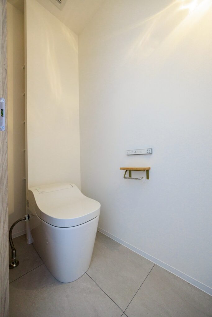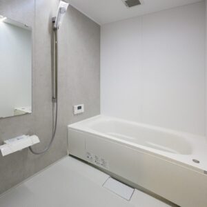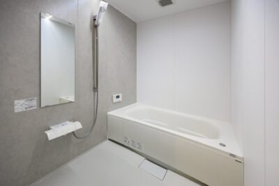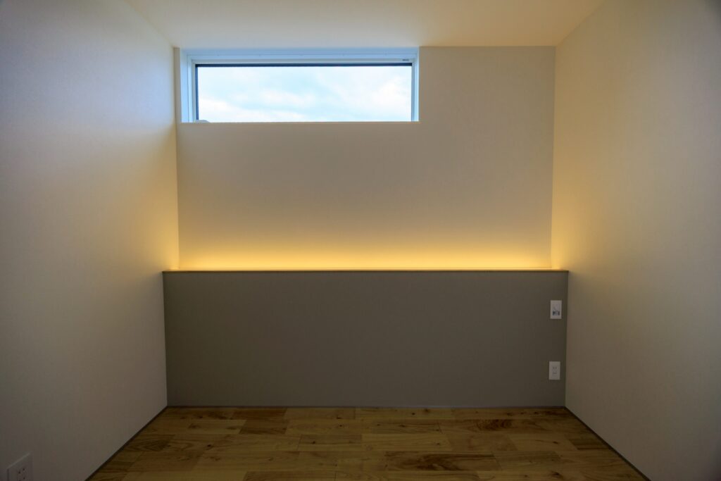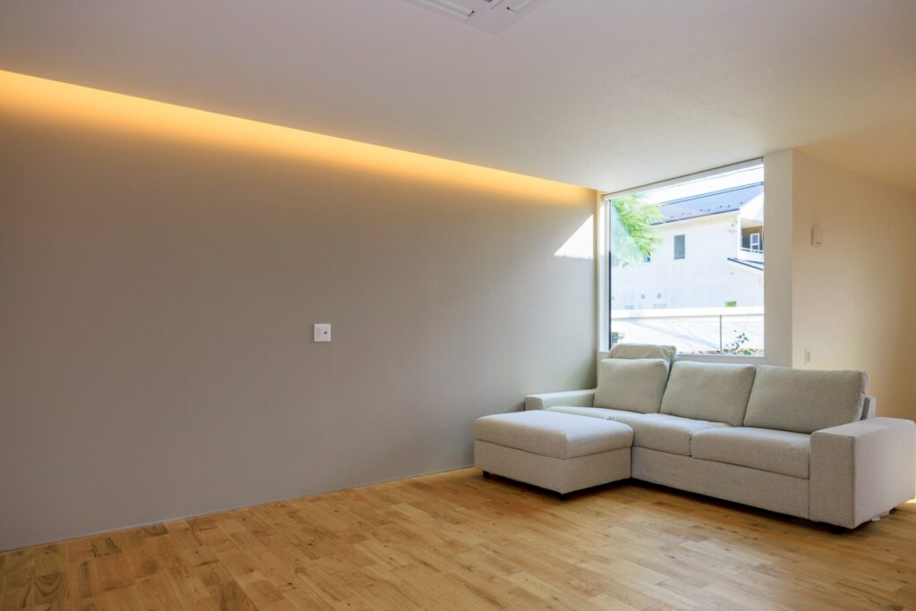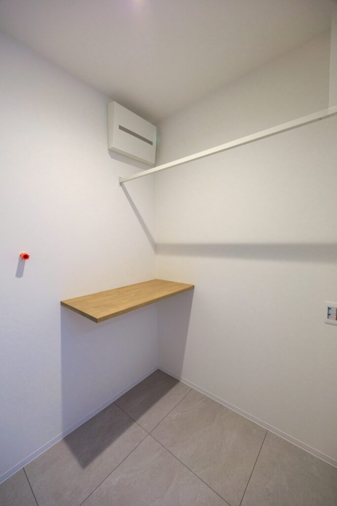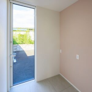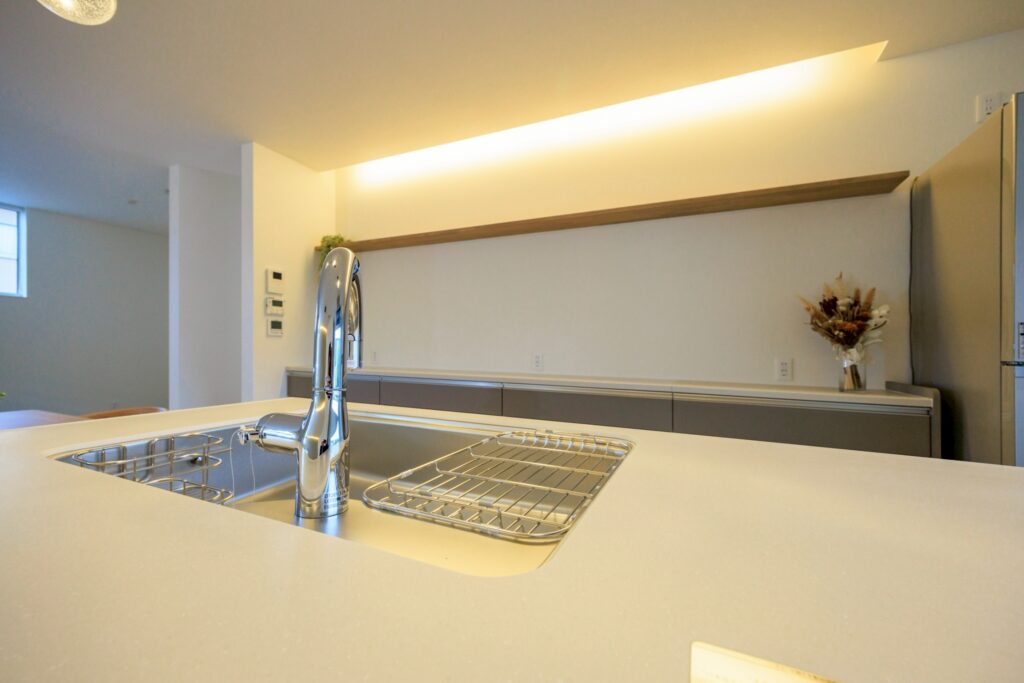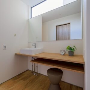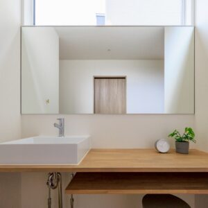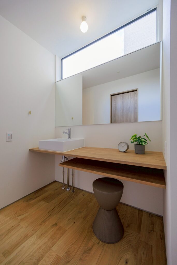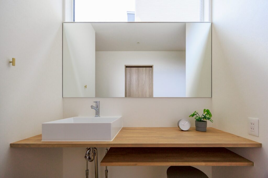 大きな一面鏡と柔らかい自然光が入る洗面。